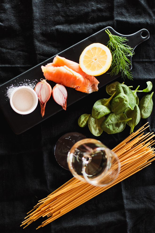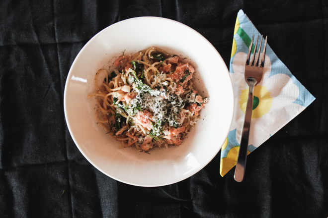 Tällä kertaa pannulle päätyi salottisipulia, jonka kuullotin voissa. Lisäsin sipulisilpun joukkoon sitruunankuorta raastettuna sekä lorauksen valkoviiniä. Heitin mukaan myös babypinaattia sekä tilliä. Sekaan raastoin vielä reilusti parmesanjuustoa. Lohi kannattaa lisätä vasta aivan loppuvaiheessa. En käyttänyt tässä pastassa kermaa, mutta halutessaan sitäkin voi hiukan kastikkeeseen lorauttaa.